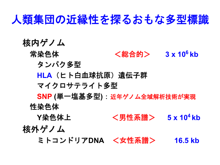 2 人類集団間の近縁性を解析するためのおもな多型標識は、細胞核の中にあるゲノムの多型標識と細胞核の外にあるゲノムの多型標識に分けられ、前者はさらに常染色体上のものと性染色体上のものに大別されます。核外の小さなゲノムであるミトコンドリアDNAの多型は女性系譜を探るのに有用であり、一方核内のY染色体上の多型は男性系譜を探るのに有用です。ゲノムのほとんどを占める核内常染色体上には膨大な数の多型があり、近年とくにゲノム全域に分布するSNP(単一塩基多型)を大規模に解析する技術が実用化され、大いに注目されています。