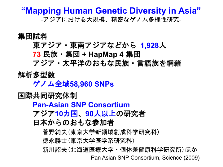 8 一方、人類集団試料のゲノム全域SNP解析も始まっています。その一つがPan-Asian SNP Consortium によるアジア系諸集団についての大規模多型解析です。アジア10カ国から90人以上の研究者が参加して、5万種以上のSNPを73民族・集団の試料について解析した空前の規模の成果が発表されました。