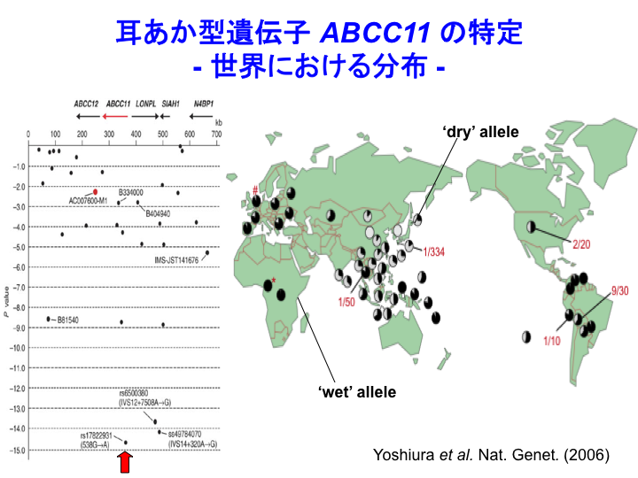 10 通常の特徴に関わる遺伝子も次々にわかるようになってきました。耳あか型は、明治時代に解剖学者足立文太郎(京都大学の初代解剖学教授)が発見した特徴です。ウェット型、ドライ型の違いはABCC11という遺伝子のたった1個のSNPが決めることを、新川詔夫(当時、長崎大)らが中心で私達も参加した日本のグループが見出しました。