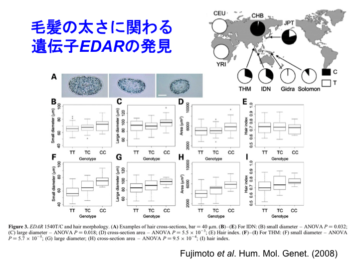 11 毛髪の太さに関わる遺伝子も見つかりました。アジア系集団は一般に毛髪が太くストレートであることが知られていますが、私達の教室の大学院博士課程の藤本明洋(現在、理研ゲノム医科学研究センター)、ポスドクの木村亮介(現在、琉球大学)、助教の大橋順(現在、筑波大学)らが、ゲノム全域の多型データベースとタイでの野外調査を活用して毛髪の太さに関わる遺伝子EDARを見出しました。この他にも、身長、眼の色などさまざまな特徴に関わる遺伝子の発見が報告されている状況です。