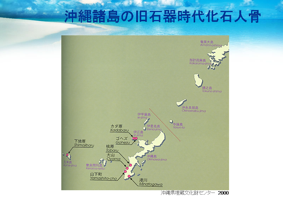 沖縄からは少なくとも7カ所の遺跡から更新世末の化石人骨が報告されている。最近では、石垣島の竿根田原(サオネタバル)遺跡から出土した化石人骨を直接C-14により年代を測定した結果、20000〜15000年前という驚くべき年代を得た。
