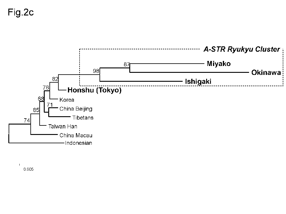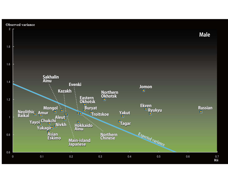 Fstを調べると、琉球列島自体の地域的変異は比較的大きいが、それぞれの島々ついて、Relethford and Blangero’s (1990)法を用いた分析では、幾分かの遺伝的浮動が示唆された。