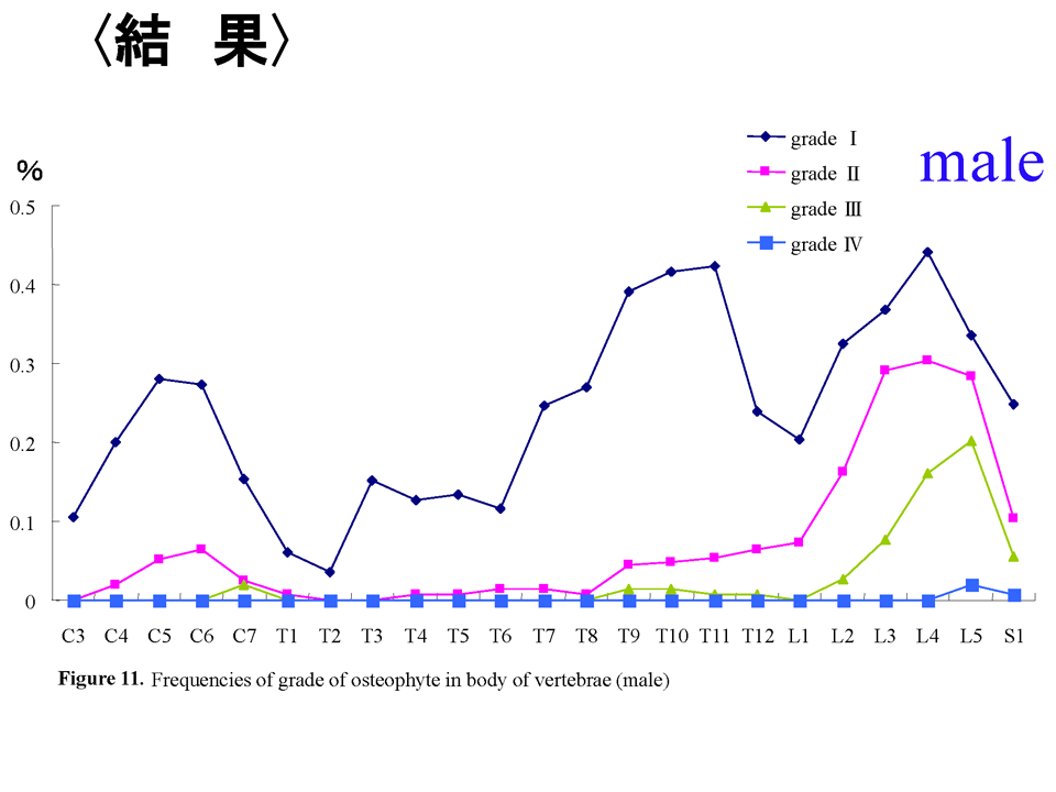 その結果、男女とも腰椎の関節症の頻度が高く、とくに椎体前縁部に関節症を多く認め、前かがみになるような農作業などの習慣的労働があったことを示唆した。