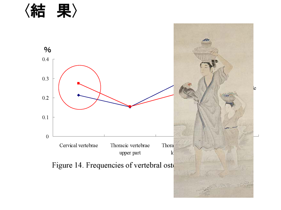 また、女性では、頚椎に頻度が高く、頭上運搬などの作業も女性の仕事であった可能性があり、民俗学者の指摘と一致した。本州の縄文時代や関東の江戸時代人骨と比較すると、関節症の頻度が低く、重症度も低く、当時の良好な生活環境がうかがえる。