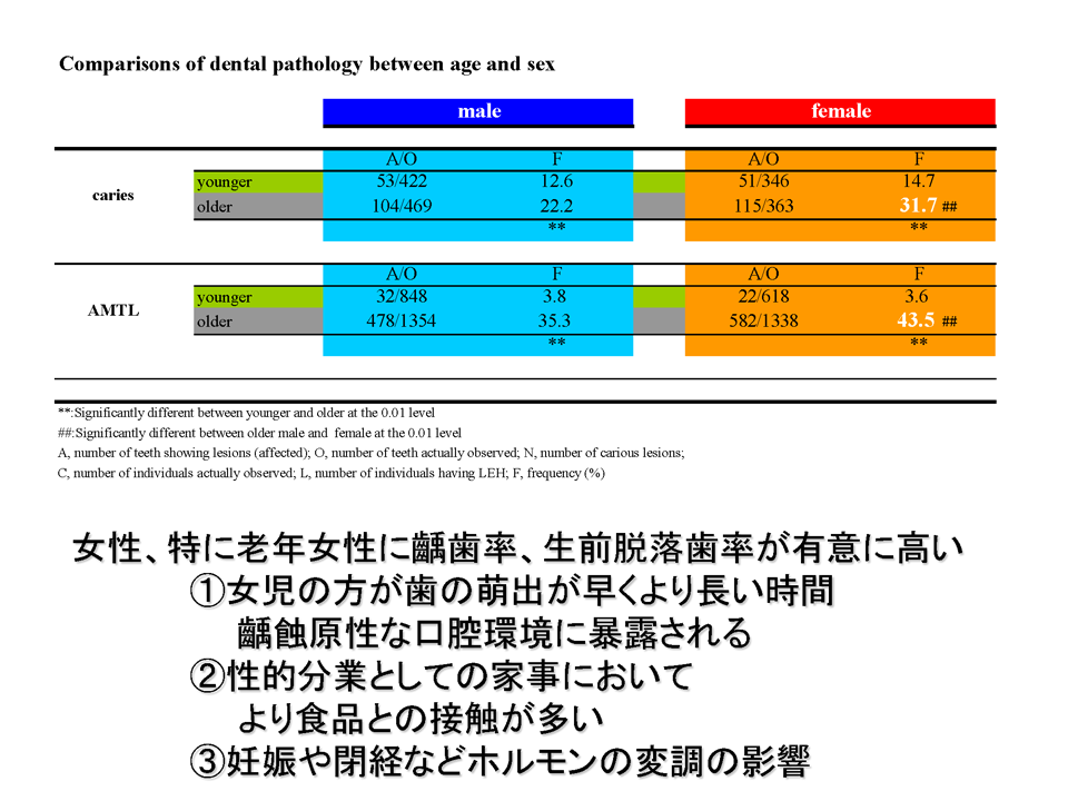 齲歯率、生前脱落歯率が女性に有意に高かったことは、妊娠や更年期など女性特有のホルモンの変化による影響に加え、米田らの安定同位体分析で、女性が炭水化物から、男性は魚類からたんぱく質を摂取する傾向があり、文化的社会的な側面からの男女間の食習慣の違いも反映していると思われる。縄文時代の狩猟採集民から近世の農耕民への変化にもかかわらず齲歯率に有意な差が無いことは、両時代の魚類とC3植物の摂取率が似ていることに関連している可能性がある。