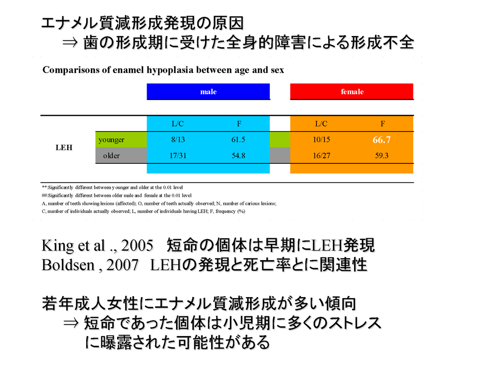 エナメル質減形成は3歳半から5歳半にかけて最も多く発生し、頻度は若年成人女性が男性よりも高く、早く死亡した個体では、幼児期にストレスが多かったことを示していると思われる。