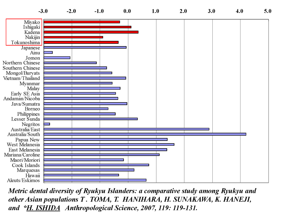 歯冠サイズで琉球列島集団はアジアの中で中間値を示すとともに、歯冠形態では相対的に近遠心径が頬舌径より大きく、他の集団とは独立したまとまりを作っていた。R-matrix法およびFstにより検討した結果、琉球列島の集団間多様性は低く、集団内多様性は特に離島集団において比較的高い値であった。