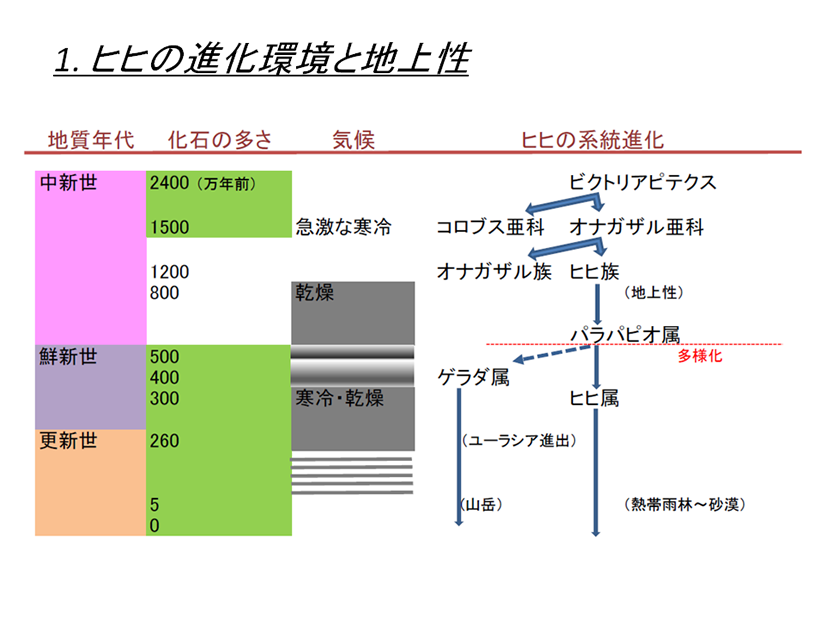 乾燥化の時期に出現した種の一部は、乾燥化によって拡大したサバンナに進出することで生息ニッチを獲得したのだろう。