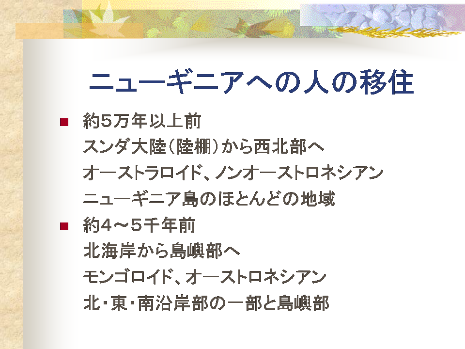 参考文献 大塚柳太郎・片山一道・印東道子編(1993) 『オセアニア1 島嶼に生きる』 東京大学出版会 大塚柳太郎(2002)「ニューギニアという地域、そして人びと」 『講座生態人類学5 ニューギニア』 京都大学学術出版会 3-22p