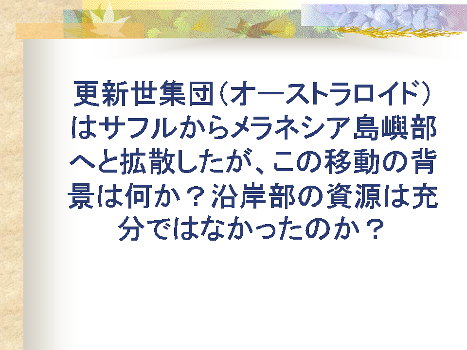 オーストロネシアンによるサフルへの移動を、スンダへのモンゴロイドの移動による避難と考えるならば、遠く逃げられる所まで逃げたいと思ったのかもしれない。また、更新世の沿岸部の資源は、現在と異なりそれほど充分ではなかった可能性もある。そもそも、キワイの狩猟対象であるノブタ、シカは完新世に、人間が持ち込んだ(モンゴロイド、白人)ものである。技術が貧困な時代には海岸部での漁撈の生産性は低かったと思われる。また、キワイの主たる漁撈域はサンゴ礁であり、更新世期にどれだけのサンゴ礁があったのか、サンゴ礁まで行けたのかは疑問でもある。