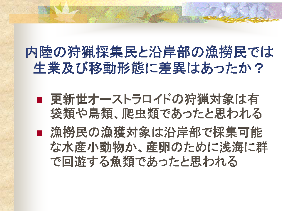 両者の獲物の生態を考えれば、内陸部の狩猟採集民の方が頻繁に移動を繰り返していた可能性はあるが、その範囲は山岳や湿地等の条件により、比較的限定的なものであったろう。漁撈民の移動は頻繁に行われなかったとしても、海岸伝いに比較的遠方まで達した可能性はあろう。さらに、植物性食料の存在も無視できないし、サゴヤシがいつから利用されていたのかも重要な問題である。