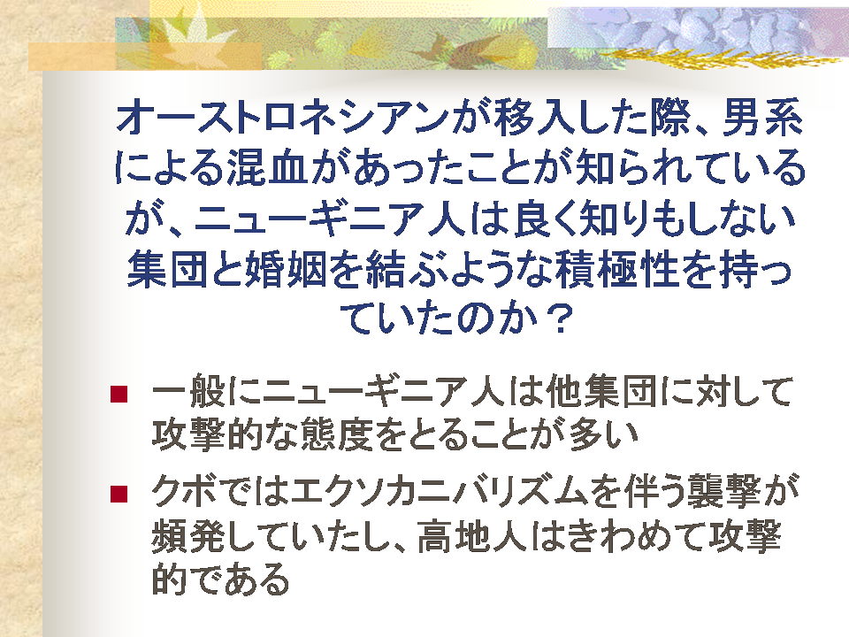 現在、ニューギニア島にオーストロネシアンがあまりいないのは、ニューギニア人に追い立てられたから、という可能性もあるのではないか。優れた海洋技術を持ったオーストロネシアンが、ニューギニアの先住集団よりもすべての面で優っていた可能性は高いとは思われるが、そうではなかった可能性もあるのかもしれない。